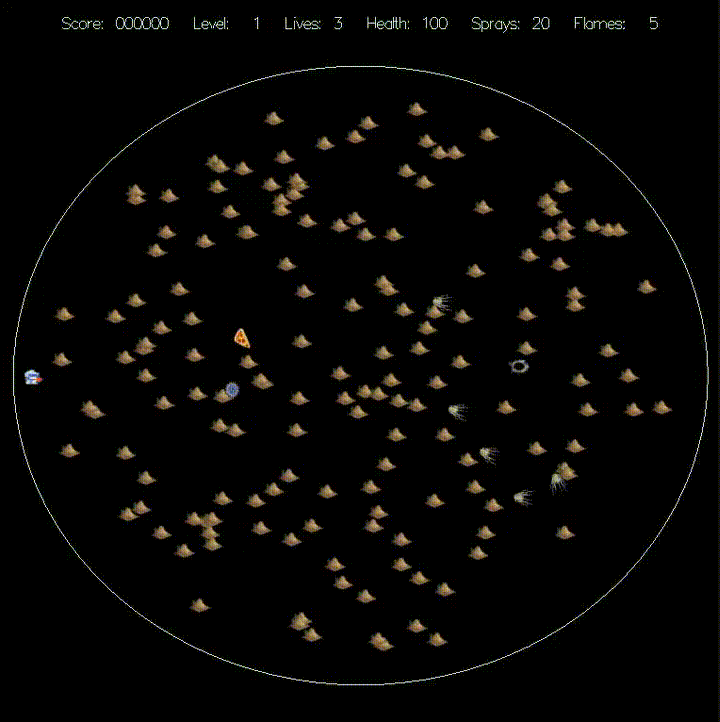 Random terrain generation happens on every new level. Dirt mounds absorb shots and bounce enemies off at random angles. Powerup spawning around the outer ring where the player moves. This includes things like health, point, and alternate projectiles to shoot. Scoreboard that keeps track of progress. Every enemy and powerup is assigned a specific point value.